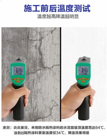 根據(jù)建筑節(jié)能體系計(jì)算,大量試驗(yàn)結(jié)果表明,當(dāng)太陽(yáng)反射率和半球發(fā)射率為0.80時(shí),反射隔熱涂料具有明顯的隔熱保溫性能,例如:以南京地區(qū)氣候?yàn)榇恚寒?dāng)太陽(yáng)反射率和半球發(fā)射率為0.80時(shí),反射隔熱涂料等效熱阻可以達(dá)到0.16~0.20m2K/W(根據(jù)朝向、基層墻體不同有區(qū)別),以廣州地區(qū)氣候?yàn)榇恚寒?dāng)太陽(yáng)反射率和半球發(fā)射率為O.80時(shí),反射隔熱涂料等效熱阻可以達(dá)到0.15~0.28m2K/W(根據(jù)朝向、基層墻體不同有區(qū)別)。